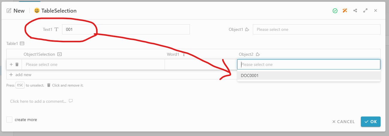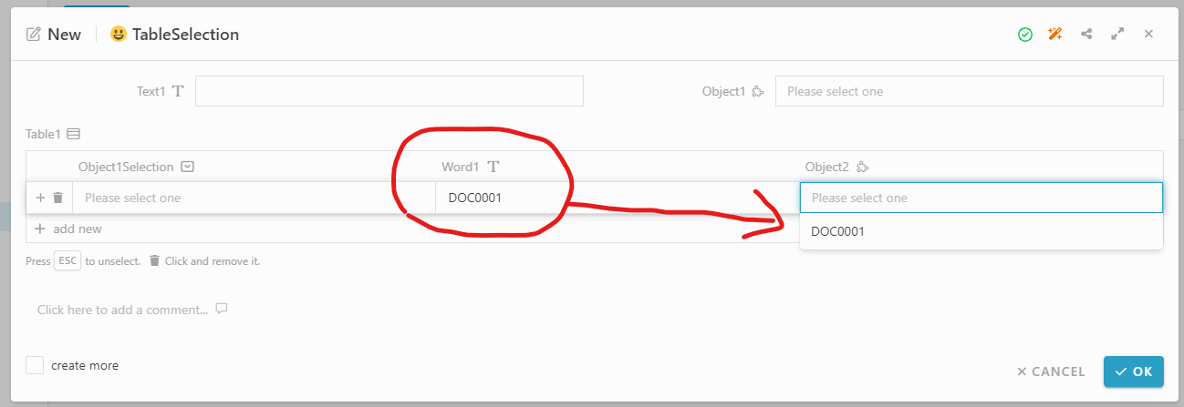 Use Word1 column field to filter the Object2 module selection in same row of table